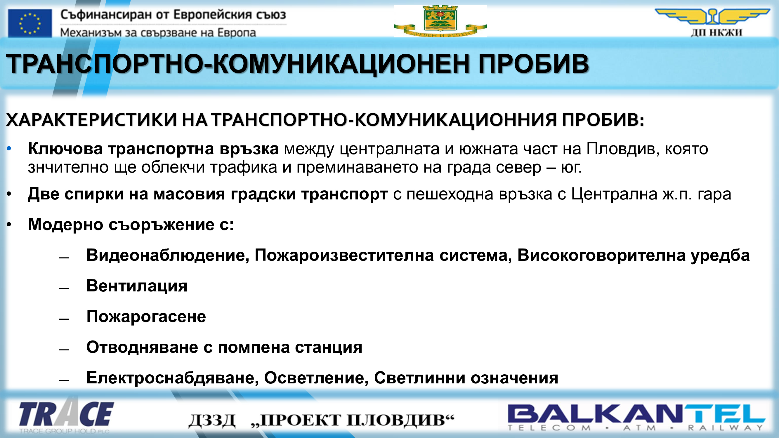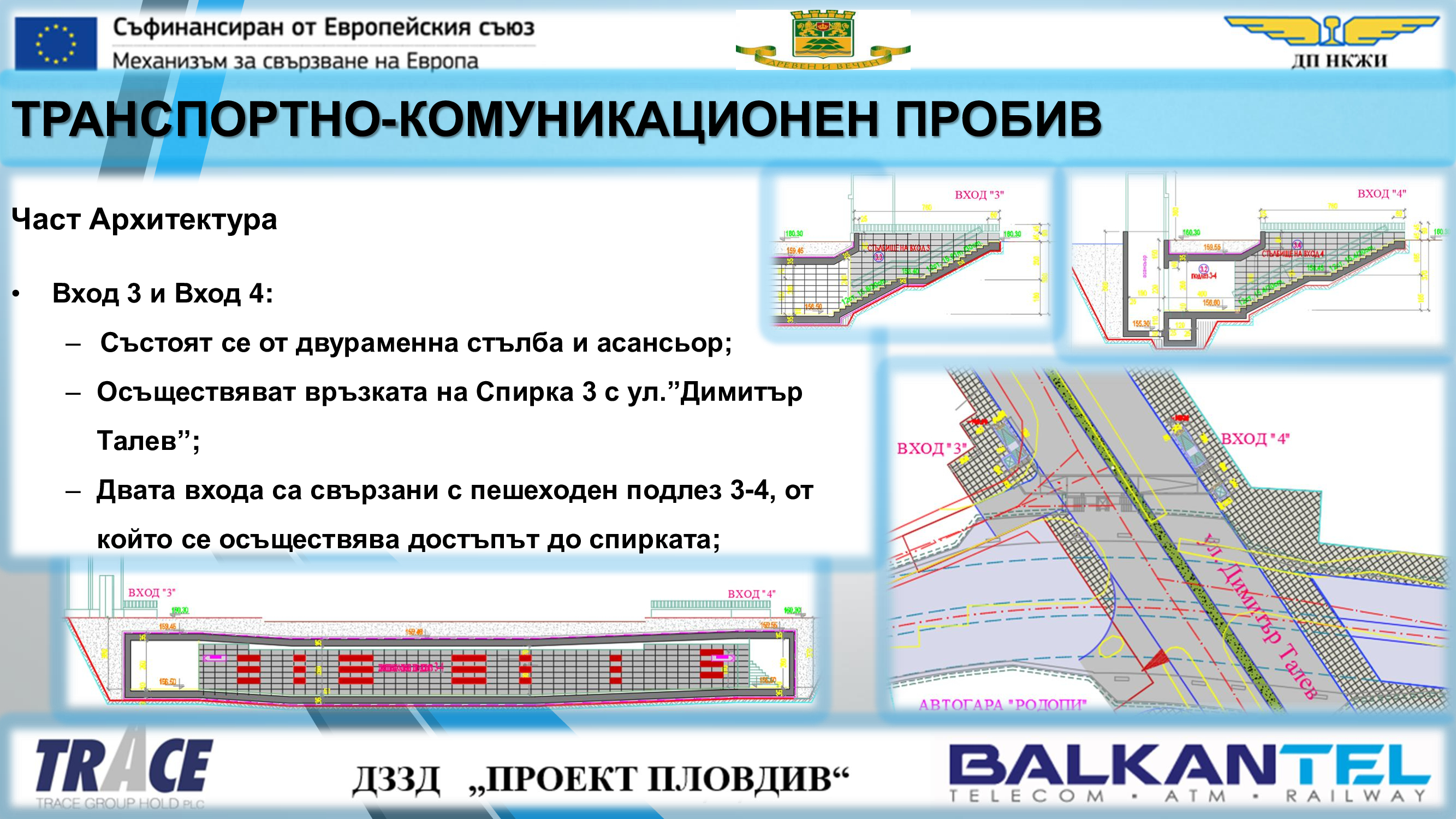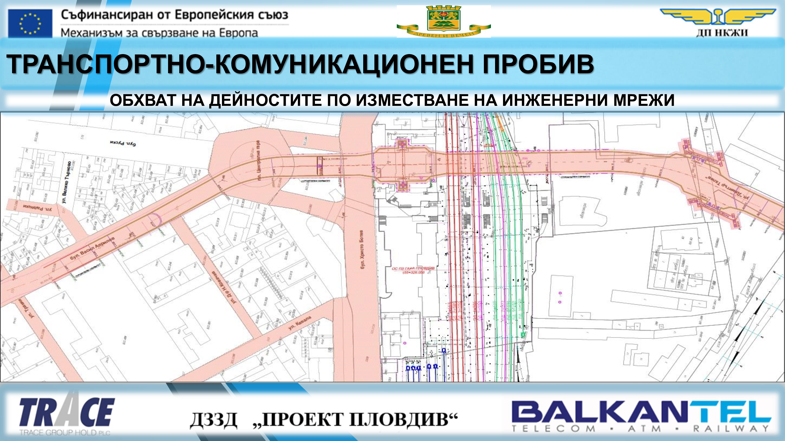 Обект „Модернизация на железен път, контактна мрежа и системи за сигнализация и телекомуникации в гара Пловдив и изграждане на комуникационно-транспортен пробив под жп ареала на гара Пловдив“ е част от проект „Развитие на железопътен възел Пловдив“ и се съфинансира със средства по Механизма за свързване на Европа (МСЕ).